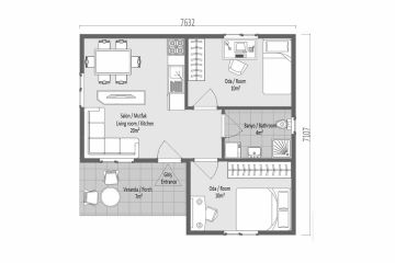51 m2 ev modeli ekonomik bütçelerle müstakil konut sahibi olmak isteyenlere özel tasarlanmıştır. Kareye yakın planıyla 2+1 daire tipinde ‘kutu gibi ev’ ifadesinin tam karşılığıdır. Amerikan salonda mutfak, iki ayrı oda ve tuvalet duş alanı planda en iyi yerleşimle yerini almış bulunuyor.