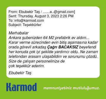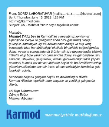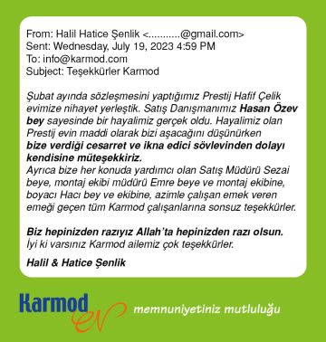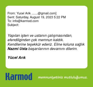 Karmod müşteri yorumlarına yansıyan memnuniyetler işini iyi yapan bir markanın haklı gururunu içerir. Satıştan proje tasarımına, üretimden sevkiyata, saha kurulumundan satış sonrası hizmetlere Karmod tam müşteri memnuniyeti için organize olmuştur. Aşağıda bu organizasyon başarısının müşteri memnuniyetine dönüşmüş güzel ifadelerini inceleyebilirsiniz.